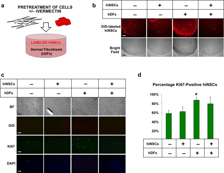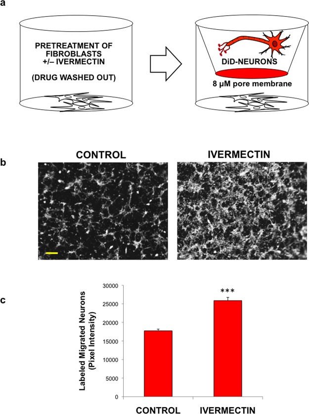 Peripheral nerves have the capacity to regenerate due to the presence of neuroprotective glia of the peripheral nervous system, Schwann cells. Upon peripheral nerve injury, Schwann cells create a permissive microenvironment for neuronal regrowth by taking up cytotoxic glutamate and secreting neurotrophic signaling molecules. Impaired peripheral nerve repair is often caused by a defective Schwann cell response after injury, and there is a critical need to develop new strategies to enhance nerve regeneration, especially in organisms with restricted regenerative potential, such as humans. One approach is to explore mechanisms in lower organisms, in which nerve repair is much more efficient. A recent study demonstrated that the antiparasitic drug, ivermectin, caused hyperinnervation of primordial eye tissue in Xenopus laevis tadpoles. Our study aimed to examine the role of ivermectin in mammalian nerve repair. We performed in vitro assays utilizing human induced neural stem cells (hiNSCs) in co-culture with human dermal fibroblasts (hDFs) and found that ivermectin-treated hDFs promote hiNSC proliferation and migration. We also characterized the effects of ivermectin on hDFs and found that ivermectin causes hDFs to uptake extracellular glutamate, secrete glial cell-derived neurotrophic factor, develop an elongated bipolar morphology, and express glial fibrillary acidic protein. Finally, in a corresponding in vivo model, we found that localized ivermectin treatment in a dermal wound site induced the upregulation of both glial and neuronal markers upon healing. Taken together, we demonstrate that ivermectin promotes peripheral nerve regeneration by inducing fibroblasts to adopt a glia-like phenotype.