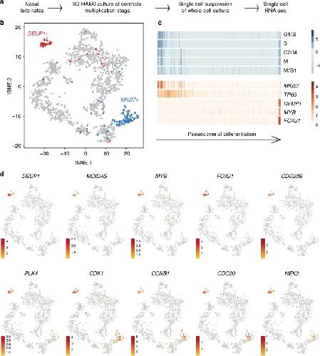 Fig. 1. Single-cell RNA-seq analysis reveals MCC transcriptome at deuterosome stage. a Experimental design of the scRNA-seq experiment. b tSNE plot. Each point is a projection of a unique cell on a 2D space generated by the tSNE algorithm. Blue dots represent MKI67-positive proliferating cells, and red dots represent DEUP1-positive cells corresponding to maturing MCCs at deuterosome stage. c Cell cycle-related gene set expression in HAECs measured by scRNA-seq. Cells were ordered along a pseudotime axis, defined with the Monocle2 package. Phase-specific scores are displayed in the top heatmap. Expression of selected genes is displayed in the bottom heatmap. d tSNEs plots for a selection of genes specifically enriched in deuterosome stage cells. Note that CDC20B exhibits the most specific expression among deuterosome marker genes |