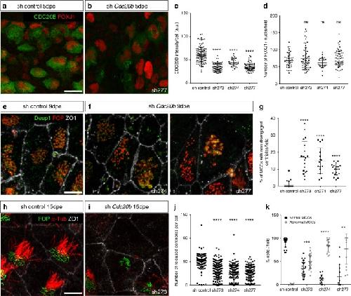 Fig. 4. CDC20B knockdown impairs multiciliogenesis in mouse ependymal MCCs. a, b Ependyma were stained for CDC20B (green) and FOXJ1 (nuclear MCC fate marker, red) 5 days post electroporation (5dpe) of control shRNA (a) or Cdc20b shRNA (b). sh277 is exemplified here, but all three Cdc20b shRNAs produced similar effects. c Graph showing the quantification of CDC20B protein levels in cells at the deuterosomal stage at 5dpe from two experiments. Mean values and standard error are shown. Unpaired t-test: ****pâ<â0.0001. d Dot plot showing the number of FOXJ1-positive nuclei observed for each field, with mean values and standard deviations from two experiments. Unpaired t-test: pâ=â0.3961 (sh273, ns), pâ=â0.1265 (sh274, ns), pâ=â0.3250 (sh277, ns). No significant variations were observed between conditions, indicating that MCC fate acquisition was not affected by Cdc20b knockdown. e, f Confocal pictures of 9dpe ependyma electroporated with control shRNA (e) or Cdc20b shRNAs (f) and stained for DEUP1 (deuterosome, green), FOP (centrioles, red) and ZO1 (cell junction, white). DEUP1-positive deuterosomes with non-disengaged FOP-positive centrioles were observed much more frequently in MCCs electroporated with Cdc20b shRNAs compared to control. g Dot plot showing the percentage of MCCs with non-disengaged centrioles per field, with mean values and standard deviations. Two experiments were analyzed. Unpaired t-test: ****pâ<â0.0001. h, i Confocal pictures of 15dpe ependyma stained for FOP (centrioles, green), α-Tubulin (α-TUB, cilia, red), and ZO1 (cell junction, white) showing the morphology of normal MCCs in shRNA control condition (h), and examples of defects observed in MCCs treated with sh Cdc20b (i). j Dot plot showing the number of released centrioles per cell, with mean values and standard deviations. k Dot plot showing the percentage of normal and abnormal MCCs per field of observation, with mean values and standard deviations. MCCs were scored abnormal when they did not display organized centriole patches associated to cilia. Three experiments were analyzed. Unpaired t-test: pâ=â0.0004 (sh273, ***), pâ=â0.0001 (sh274, ****), pâ=â0.0038 (sh277, **). Scale bars: 20âμm (a), 5μm (e, i) |