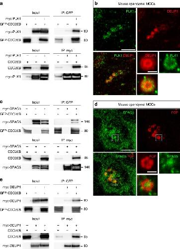 Fig. 6. CDC20B interacts with PLK1, SPAG5, and DEUP1. a, c, e Co-immunoprecipitations of PLK1, SPAG5, and DEUP1 with CDC20B were tested after transfections of different constructs in HEK cells, indicated at the top of each panel. Proteins (left legend) were revealed by immunoblotting. Representative blots from 3 independent experiments. b, d Maturing mouse ependyma were immunostained for the indicated proteins, and pictures were taken with a confocal microscope. PLK1 and SPAG5 are expressed in maturing MCCs. In b, zoom was made on a different cell to reveal PLK1 enrichment in the perideuterosomal region. In d, zoom was made on the dashed box to reveal SPAG5 enrichment in the deuterosome core. Scale bars in b, d: 5âµm (large view), 1âµm (high magnification) |