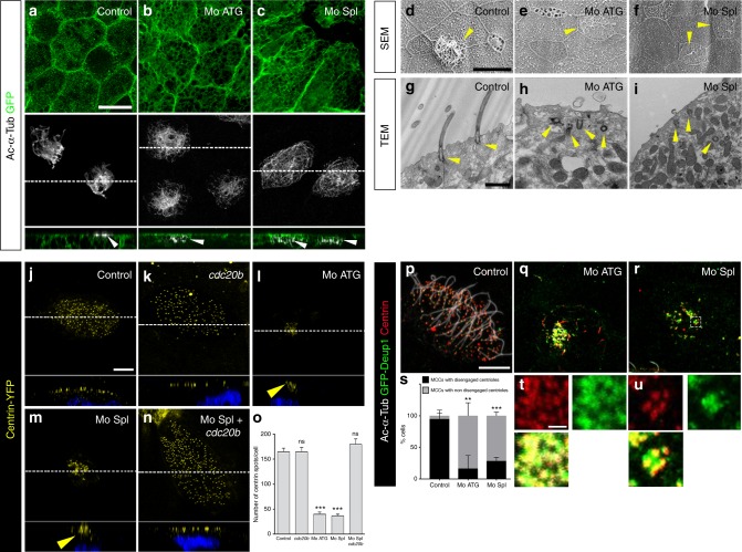 Fig. 5. cdc20b knockdown impairs multiciliogenesis in Xenopus epidermal MCCs. aâc 8-cell embryos were injected in presumptive epidermis with GFP-CAAX mRNA and cdc20b morpholinos, as indicated. Embryos at tailbud st25 were processed for fluorescent staining against GFP (injection tracer, green) and Acetylated-α-Tubulin (Ac-α-Tub, cilia, white). White dotted lines indicate the position of orthogonal projections shown in bottom panels. Note that cdc20b morphant MCCs display cytoplasmic filaments but do not grow cilia (white arrowheads). dâf Scanning electron microscopy (SEM) of control (d) and cdc20b morphant (e, f) embryos at tadpole st31. Yellow arrowheads point at normal (d) and defective MCCs (e, f). gâi Transmission electron microscopy (TEM) of control (g) and cdc20b morphant (h, i) embryos at tailbud st25. Yellow arrowheads point at normally docked basal bodies supporting cilia (g) and undocked centrioles unable to support cilia (h, i). jân 8-cell embryos were injected in presumptive epidermis with centrin-YFP mRNA, cdc20b morpholinos, and cdc20b mRNA, as indicated. Centrin-YFP fluorescence was observed directly to reveal centrioles (yellow). Nuclei were revealed by DAPI staining in blue. White dotted lines indicate the position of orthogonal projections shown in bottom panels. Yellow arrowheads point at undocked centrioles. o Bar graph showing the mean number of BBs per MCC, and standard error mean, as counted by Centrin-YFP dots. One-way ANOVA and Bonferroniâs multiple comparisons test on two experiments, ***pâ<â0.0001. cdc20b knockdown significantly reduced the number of BBs per cell, and this defect could be corrected by cdc20b co-injection with Mo Spl. pâu Embryos were injected with Multicilin-hGR and GFP-Deup1 mRNAs, treated with dexamethasone at gastrula st11 to induce Multicilin activity, and immunostained at neurula st23 against Acetylated-α-tubulin (cilia, white), GFP (deuterosomes, green), and Centrin (centrioles, red). p Control cells showed individual centrioles, many of which had initiated ciliogenesis. Note that Deup1-positive deuterosomes were no longer visible at this stage. (q, r, t, u) cdc20b morphant MCCs showed procentrioles still engaged on deuterosomes and lacked cilia. In t and u, zooms were made on regions identified by dashed boxes in q and r. s Bar graph showing the mean percentage of cells that completed or not centriole disengagement with standard deviations. Three experiments were analyzed. Unpaired t-test: pâ=â0.0037 (Mo ATG, **), pâ=â0.0004 (Mo Spl, ***). Scale bars: 20âµm (a, d), 1âµm (g, t), 5âµm (j, p) |