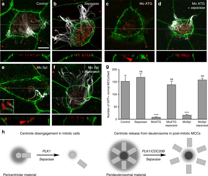 Fig. 7. Separase overexpression rescues multiciliogenesis in absence of Cdc20b. aâf 8-cell Xenopus embryos were injected in the presumptive epidermis with GFP-gpi mRNA, cdc20b morpholinos, and human Separase mRNA, as indicated. Embryos were fixed at tailbud st25 and immunostained against GFP (injection tracer, green), Acetylated-α-Tubulin (cilia, white) and É£-Tubulin (BBs, red). White dotted lines indicate the position of orthogonal projections shown in bottom panels. Red arrowheads point undocked BBs. Left inset in e shows zoom on clustered centrioles. g Bar graph showing the mean number of properly ciliated MCCs among injected cells, per field of observation, with standard error mean, from two independent experiments. Counting was performed on pictures taken at low magnification (Ã20), in order to score a large number of cells. Separase overexpression fully rescued multiciliogenesis in cdc20b morphant MCCs. One-way ANOVA and Bonferroniâs multiple comparisons on two experiments, ***pâ<â0.0001, nspâ>â0.05. Scale bars: 5âµm (a). h Model illustrating the analogy between centriole disengagement in mitotic cells and centriole release from deuterosomes in post-mitotic MCCs |