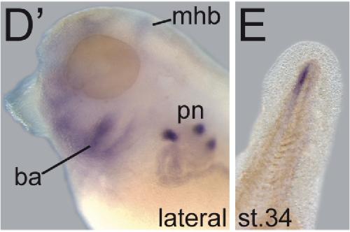 pkd2 (polycystin 2, transient receptor potential cation channel) gene expression in Xenopus laevis embryo, head region, assayed via in situ hybridization, NF stage 36, and tail tip at NF stage 34, lateral view, anterior left, dorsal up. Key: pn, pronephric nephrostomes; ba, pharyngeal/branchial arches; mhb, mid hindbrain boundary. |