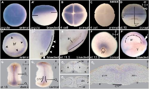 Figure 1. Expression of pkd2 mRNA during Xenopus Embryogenesis. (AâC) Maternally deposited mRNA localized to the animal hemisphere of the zygote (A, Aâ²) and four-cell stage embryos (B). Note animal-vegetal shift of expression as indicated in the zygote. (C) Lack of a specific signal in specimen hybridized with a sense probe. (DâF) pkd2 transcripts in deep mesodermal layers of the early gastrula (D, Dâ², Dâ²; black arrowheads; plane of section indicated in D by dotted line), in dorsal notochordal mesoderm at mid gastrula (E), and in tail organizer (white arrow) and posterior notochord at late gastrula stages (F, Fâ²). Please note the lack of transcripts in the dorsal lip and the SM (white arrowheads). Border of inner and outer layer of marginal zone indicated by dotted line. Yolk plug and archenteron roof indicated by dashed lines. (G) Deep neuroectodermal, tail organizer, and posterior notochordal expression at neurula stages; no expression of GRP detected (G4). a, anterior; an, animal; ar, archenteron; bf, blastocoel floor; cbc, circumblastoporal collar; dl, dorsal lip; e, endoderm; el, epithelial layer (of cbc); l, left; n, notochord; ne, neuroectoderm; psm, presomitic mesoderm; r, right; s, somites; v, ventral; veg, vegetal; yp, yolk plug. |