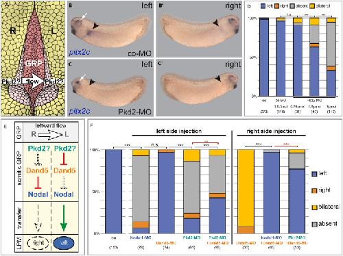 Figure 2. pkd2 Is Required for LR Asymmetry in Xenopus, Independently of dand5(A) Putative sensory function of Polycystin-2 during symmetry breakage downstream of GRP-flow.(BâD) Dose-dependent loss of left-sided pitx2c expression following Pkd2-MO targeting to the GRP. Black arrowhead indicates approximate location of present or absent pitx2c expression on both sides of the embryo. White arrow highlights expression of pitx2c around the eye as proof of working ISH.(E) Model of hierarchy of the flow sensing module and possible role of pkd2 on the lateral side of the LRO downstream of flow and upstream of Dand5.(F) Epistatic single and double knockdown experiments, performed on the left or right side, as indicated. Differences in expected and experimental outcome highlighted by red significance. See text for details.See also Figure S2.**p < 0.01, ***p < 0.001 in all Figures.Numbers in parentheses indicate the number of embryos analyzed for each condition. |