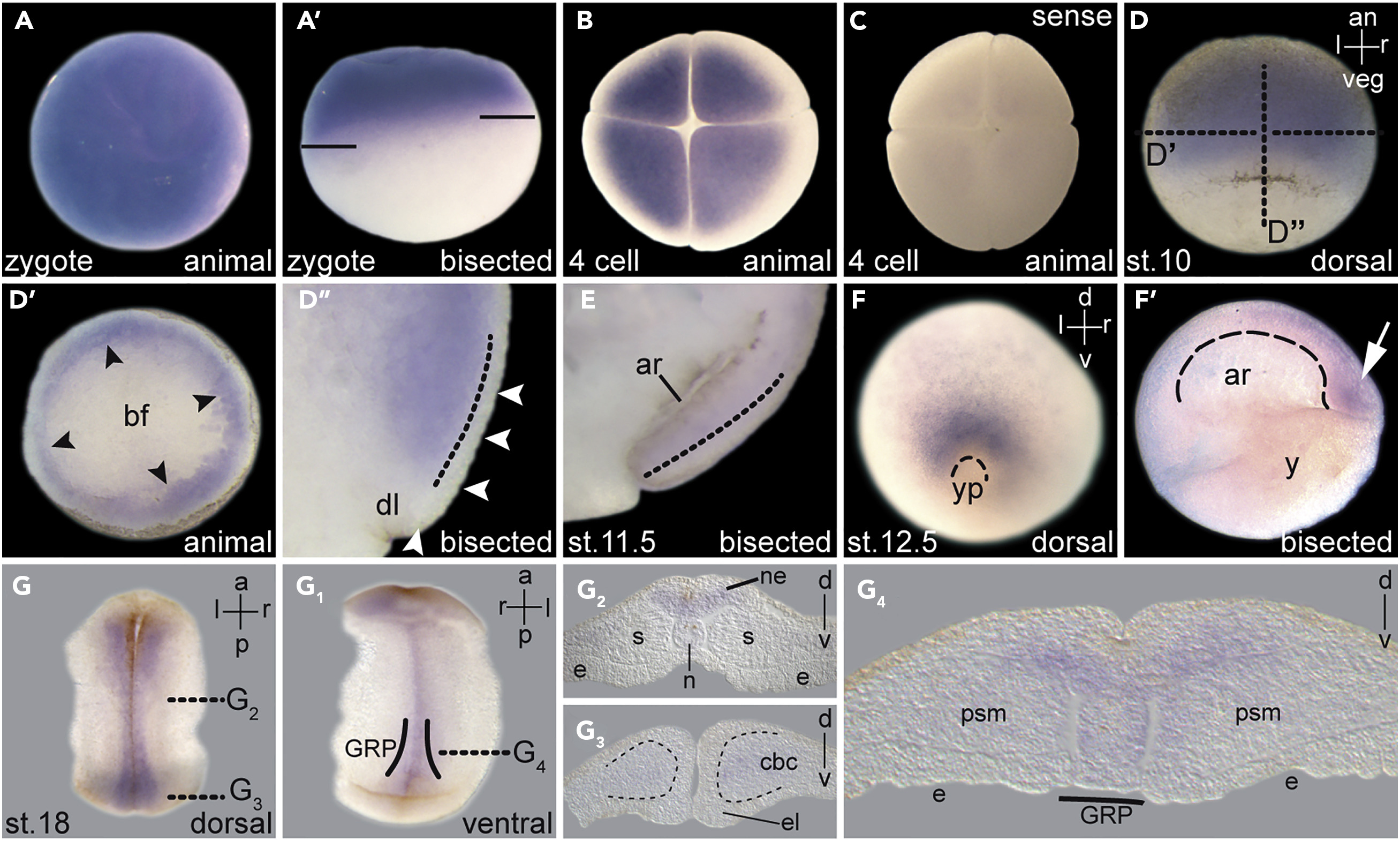 Figure 1. Expression of pkd2 mRNA during Xenopus Embryogenesis(AâC) Maternally deposited mRNA localized to the animal hemisphere of the zygote (A, Aâ²) and four-cell stage embryos (B). Note animal-vegetal shift of expression as indicated in the zygote. (C) Lack of a specific signal in specimen hybridized with a sense probe.(DâF) pkd2 transcripts in deep mesodermal layers of the early gastrula (D, Dâ², Dâ³; black arrowheads; plane of section indicated in D by dotted line), in dorsal notochordal mesoderm at mid gastrula (E), and in tail organizer (white arrow) and posterior notochord at late gastrula stages (F, Fâ²). Please note the lack of transcripts in the dorsal lip and the SM (white arrowheads). Border of inner and outer layer of marginal zone indicated by dotted line. Yolk plug and archenteron roof indicated by dashed lines.(G) Deep neuroectodermal, tail organizer, and posterior notochordal expression at neurula stages; no expression of GRP detected (G4).a, anterior; an, animal; ar, archenteron; bf, blastocoel floor; cbc, circumblastoporal collar; dl, dorsal lip; e, endoderm; el, epithelial layer (of cbc); l, left; n, notochord; ne, neuroectoderm; psm, presomitic mesoderm; r, right; s, somites; v, ventral; veg, vegetal; yp, yolk plug.See also Figure S1. |