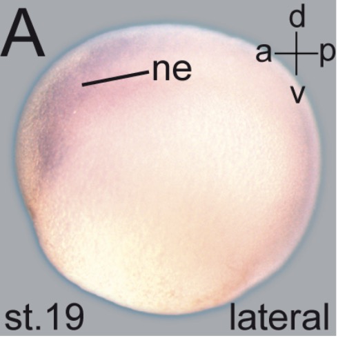 pkd2 (polycystin 2, transient receptor potential cation channel) gene expression in Xenopus laevis embryo, assayed via in situ hybridization, NF stage 19, lateral view, anterior left, dorsal up. Key: ne= neuroectoderm. |
