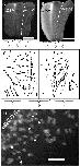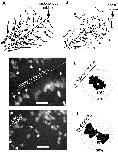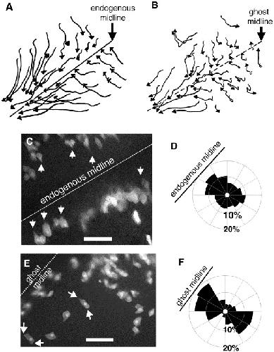 Fig. 2. Cell paths and cell protrusive activity in deep-neural-over-mesoderm and midlineless explants. In (A, B), tips of arrows show the position of cells at the beginning of a time lapse, the arrowhead represents cell location at the end of the time lapse, and the stem depicts the path of the cell. (A) Lateral cells in deep-neural-over-mesoderm explants translocate medially toward the midline notochord/floor plate, resulting in convergence and extension. (B) Even though the midline tissues have been removed, lateral neural cells in midlineless explants also move medially toward the midline of the explants, albeit they do so less aggressively than cells in deep-neural-over-mesoderm explants. Arrows at the edge of the explants move outward. These are probably ectodermal cells, and can sometimes be seen in deep-neural-over-mesoderm explants, though more rarely than in midlineless explants because they are generally too wide to encompass ectodermal cells on the computer screen. (C, D) The protrusive activity of lateral neural cells in deep-neural-over-mesoderm and midlineless explants. (C) Lateral neural cells in deep-neural-over mesoderm explants have lamellopodia pointed toward the midline. Arrows point to protrusions. (D) A bullet diagram quantifies the protrusions of one cell traced from a control explant; it shows a clear bias in the direction of the midline tissues in the explant. Scale bar, 0.1 mm. (E, F) The protrusive activity of lateral neural cells in midlineless explants. (E) Frame from a time-lapse sequence, showing motile cells in midlineless explants. Arrows point to protrusions. (F) A bullet diagram shows the distribution of protrusions over time for one cell analyzed from a midlineless explant; the cell is aligned along the mediolateral axis of the explant. Scale bar, 0.1 mm. |