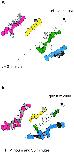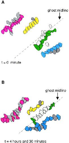 Fig. 3. Conservative intercalation occurs in midlineless explants. Colored cells show columns of cells that were traced to the end of the movie to see which cells intervened between them. Patterned cells are the cells that intervened between the colored cells. (A) Unbroken columns of cells at the beginning of a timelapse series. (B) By the end of the time lapse, patterned cells have intercalated between the colored cells; however, they were very close neighbors of the colored cells at t = 0. |