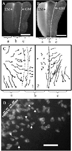 Fig. 4. Motility in midlineless-explants-with ectopic-midline. (A, B) A midlineless-explant-with-ectopic-midline made from an Otx2:GFP transgenic embryo converges and extends between t = 0 (A) and t = 4.5 h (B). The notochord lights up with GFP driven by the Otx2 promoter, demarcating the ectopic midline; the ghost midline is shown as a dotted white line. Labeled cells (white sprinkle) sandwiched between the ectopic midline and the ghost midline (section âbâ) were followed for translocation (direction of their overall displacement) and protrusive activity. Scale bar in (A) and (B), 0.5 mm. (C) In midlineless-explants-with-ectopic-midline, cells in the neural plate of the donor midline (section âaâ) converge to that midline. The two parallel dashed lines represent the edges of the notochord seen through the deep neural plate. Cells in the midlineless component of the explant (section âbâ) still converge and extend, although their movement is erratic. Cells in section âcâ get displaced toward their endogenous (ghost) midline through intercalation. The two parallel dashed lines represent the ectopic midline, and the dotted line is the ghost midline, at the beginning of the time-lapse sequence. The two panels, (1) and (2), come from two different embryos. (D) Frame from a movie shows protrusive cells in the section âbâ of an explant with an ectopic midline. Arrows point to protrusions. Scale bar; 0.1 mm. |