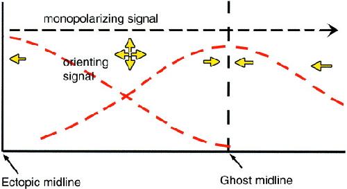 Fig. 7. The two-signal model for the mechanism through which the midline might polarize and orient neural cells. A persistent signal from the midline orients neural cells (red curves) and a distinct, short-lived signal monopolarizes them (black arrows). The monopolarizing signal passes unabated through the length of the explant, and neural cells respond by becoming monopolar protrusive. These monopolar protrusive cells direct their protrusions to the strongest source of orienting signal. This may be the ghost midline or the ectopic midline, and under normal circumstances, it is the endogenous midline. Cells that are equidistant between the ghost and the ectopic midline in midlineless-explants-with-ectopic-midline cannot clearly make out the direction of the orienting signal, and as a result, they protrude monopolarly but in random directions. The direction of monopolar cells in response to the orienting signal is shown with yellow arrows. Hypothetically, a high level of orienting factors is found near the ectopic midline, and the levels taper off with increasing distance from the midline, due to the effects of diffusion. Closest to the ghost midline, the leftover signal from the extracted midline still orients cells medially. |