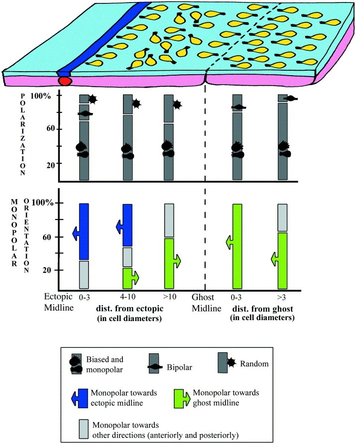 Fig. 5. Polarization and orientation of cells in midlineless-explants-with-ectopic-midline. The schematic at the top summarizes the state of polarization of cells in this style of explant. All cells become monopolar and oriented to whichever midline is closest to them, except for cells that are equidistant from the ghost and the ectopic midline, which instead point toward more random directions. Below the schematic of the explant, the two graphs categorize cells by distance from the ectopic or the ghost midline along the x-axis (0–3, 4–10, and over 10 cells away from the ectopic midline; 0–3 and over 3 cells away from the ghost midline). The top graph shows the percentage of cells in particular polarization states (monopolar and biased combined, bipolar, and random), and the bottom graph shows the percentage of monopolar cells that point in particular orientation. |