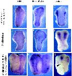 Fig. 6. Patterning of deep-neural-over-mesoderm explants, midlineless explants and midlineless-explants-with-ectopic-midline. Deep-neural-over-mesoderm explants maintain a very close to normal mediolateral pattern of gene expression as seen through Sonic Hedgehog, N-β-tubulin, and Xslug (AâC). Midlineless explants have no remaining midline, as shown by the absence of SHH expression (D). They express N-β-tubulin, but the pattern of expression of that gene is often disturbed (E), while Xslug is strongly expressed, though variable in breadth (F). Midlineless-explants-with-ectopic-midline have no SHH stripe in the midlineless portion, but it is present in the portion of the ectopic midline as expected (G). In addition, they express N-β-tubulin and Xslug in both the midline-free and the midline-containing parts of the explants (H, I). Pointers indicate the ectopic midline; all explants were fixed for in situ when whole embryos used as control reached stage 21 to 23. |