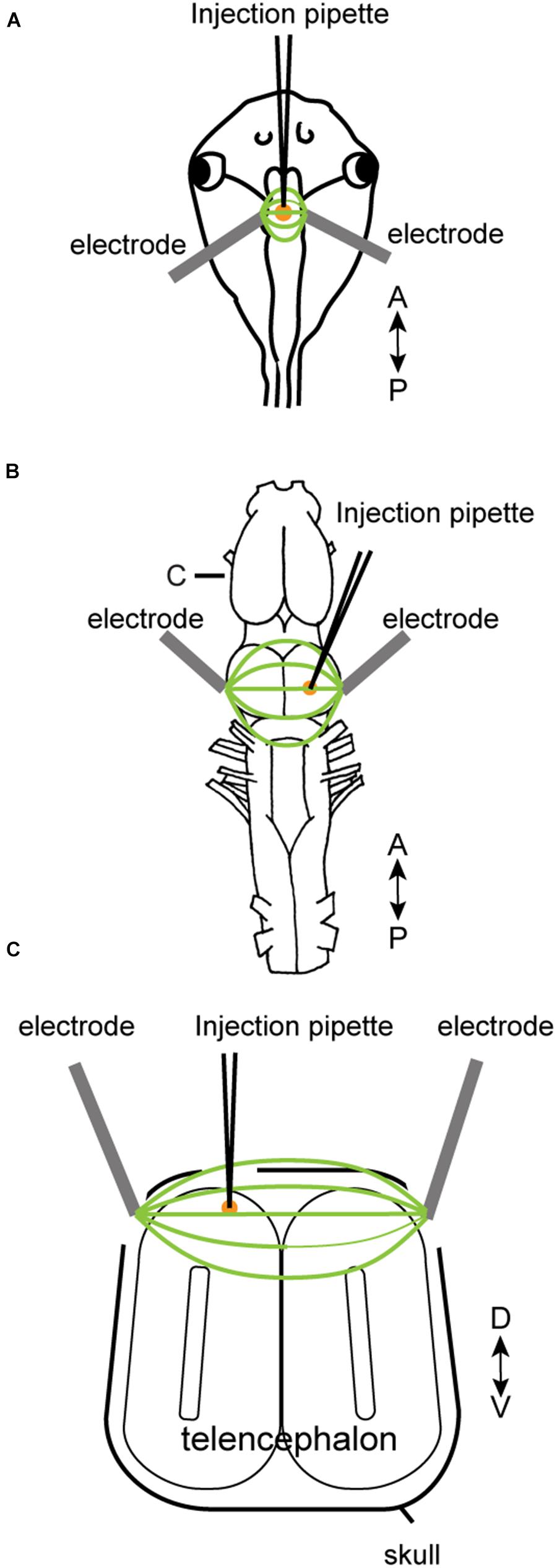 FIGURE 1. Electroporation setup used for tadpoles in vivo (A), for adult brain in vitro (B), and adult brain in vivo (C). A glass pipette containing plasmid suspension was lowered into the brain (A–C), and plasmid was pressure-injected. Following the injection, electrical pulses were applied to a pair of platinum electrodes placed on the two sides of the injection area. A small amount of calcium-free Steinberg solution (tadpoles) or frog saline (adults) were applied to cover the tips of the two electrodes along with the injection area. (C) Transverse section of the telencephalon at the level indicated as (C) in (B).