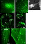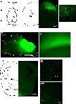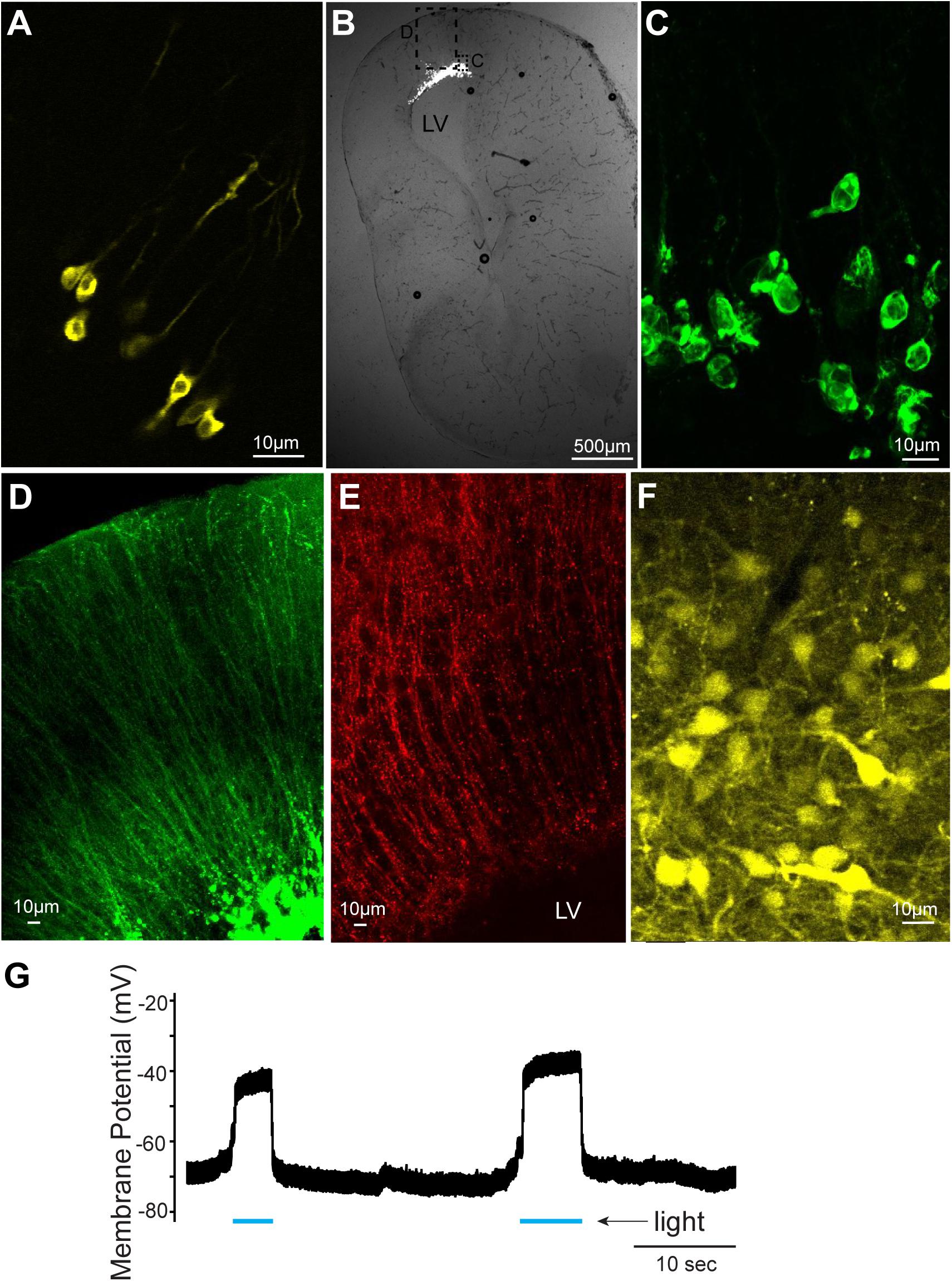 FIGURE 2. Cells labeled with fluorescent proteins after electroporation and Adeno-associated virus (AAV) injection. (A) Yellow fluorescent protein (YFP)-labeled tadpole neurons 1 day after plasmids were electroporated in vivo. (B) Transverse section of lefttelencephalon of adult X. laevis 5 days after plasmids were electroporated in vivo. LV indicates lateralventricle. (C) Green fluorescent protein (GFP)-expressing cells (inset shown in C) that lack processes of neurons, presumed to be glial cells. (D) Labeled processes of glial-like cells (inset shown in C) that seem to form the ependymal lining of the ventricle. (E) Vimentin-positive radial glial cells in the adult telencephalon. (F) YFP-labeled telencephalic neurons of one of the very few brains that expressed reporter genes in response to AAV injection. (G) Membrane potential of a presumed glial cell electroporated with plasmid (pCS2FA.ChR2.YFP) positive for YFP and Channelrhodopsin 2 (ChR2). In response to blue light exposure (indicated in blue lines below the trace), the membrane potential depolarized, presumably because of the ChR2 expression, but the cell never spiked an action potential.