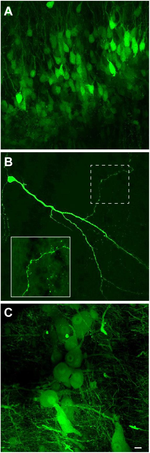 FIGURE 3. Neuroanatomical evidence that recombinant vesicular stomatitis virus encoding its own glycoprotein [rVSV(VSV-G)] transduce adult X. laevis neurons (i.e., transgene was moved from the virus to the neurons). (A) Adult X. laevis neurons in telencephalon expressing reporter gene (Venus 2) 48 h after injection of rVSV(VSV-G) plaque 21. Transduction efficiency was 86% (24/28 animals). (B) A lone infected neuron in optic tectum away from the injection site with a robust expression of reporter gene in dendrites, axons, dendritic spines and synaptic boutons observed 68 h after injection of rVSV(VSV-G) plaque 21. A dotted area is enlarged in the bottom left. (C) Neurons in laryngeal motor nucleus (n.IX-X) expressing Venus 2 48 h after injection of rVSV(VSV-G) plaque 21. The transduction efficiency in the brainstem with this strain of virus was 50% (9/18 animals). Scale bar is 10 μm, and applies for all three panels.