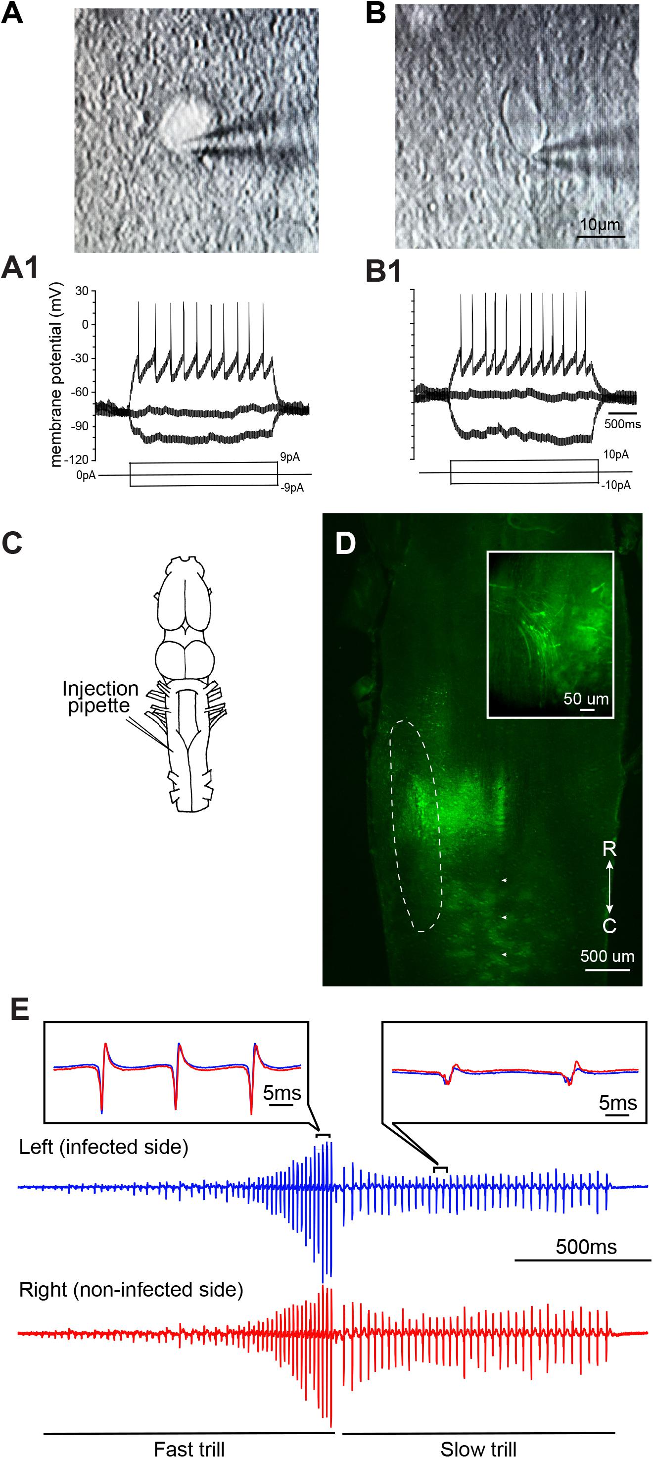 FIGURE 4. Neurons infected with vesicular stomatitis virus (VSV) are physiologically functional. (A) Differential interference contrast (DIC) image of an adult X. laevis telencephalic neuron expressing reporter gene (enhanced green fluorescent protein, eGFP) in a whole-cell patch-clamp configuration. The brain was injected with recombinant VSV encoding rabies glycoprotein [rVSV(RABV-G)] 2 days prior to the recordings was obtained. (A1) Membrane potential in response to current injections into the neuron shown in (A). (B) A DIC image of a non-labeled telencephalic neuron near the neuron shown in (A) on the same slice preparation. (B1) Membrane potential of neuron B in response to current injection. (C) Schematic diagram illustrating the unilateral injection of recombinant vesicular stomatitis virus encoding its own glycoprotein [rVSV(VSV-G)] into the laryngeal motor nucleus, n.IX-X. (D) Horizontal section of the brainstem showing the labeled neurons in the n.IX-X (encircled in dotted white line) 2 days after rVSV(VSV-G) was injected. Reporter gene expression was observed in the somata and axons (inset) of vocal motoneurons. White arrowheads indicate the midline. (E) A fictive advertisement call elicited from the isolated infected brain shown in (D) in response to the application of serotonin (5-HT). The advertisement call is made of fast and slow trills (labeled below the traces). Extracellular recordings obtained from the left (blue) and right (red) laryngeal nerves are shown. Inset shows enlarged sections of the left and right extracellular recording traces superimposed to demonstrate the temporal synchrony.