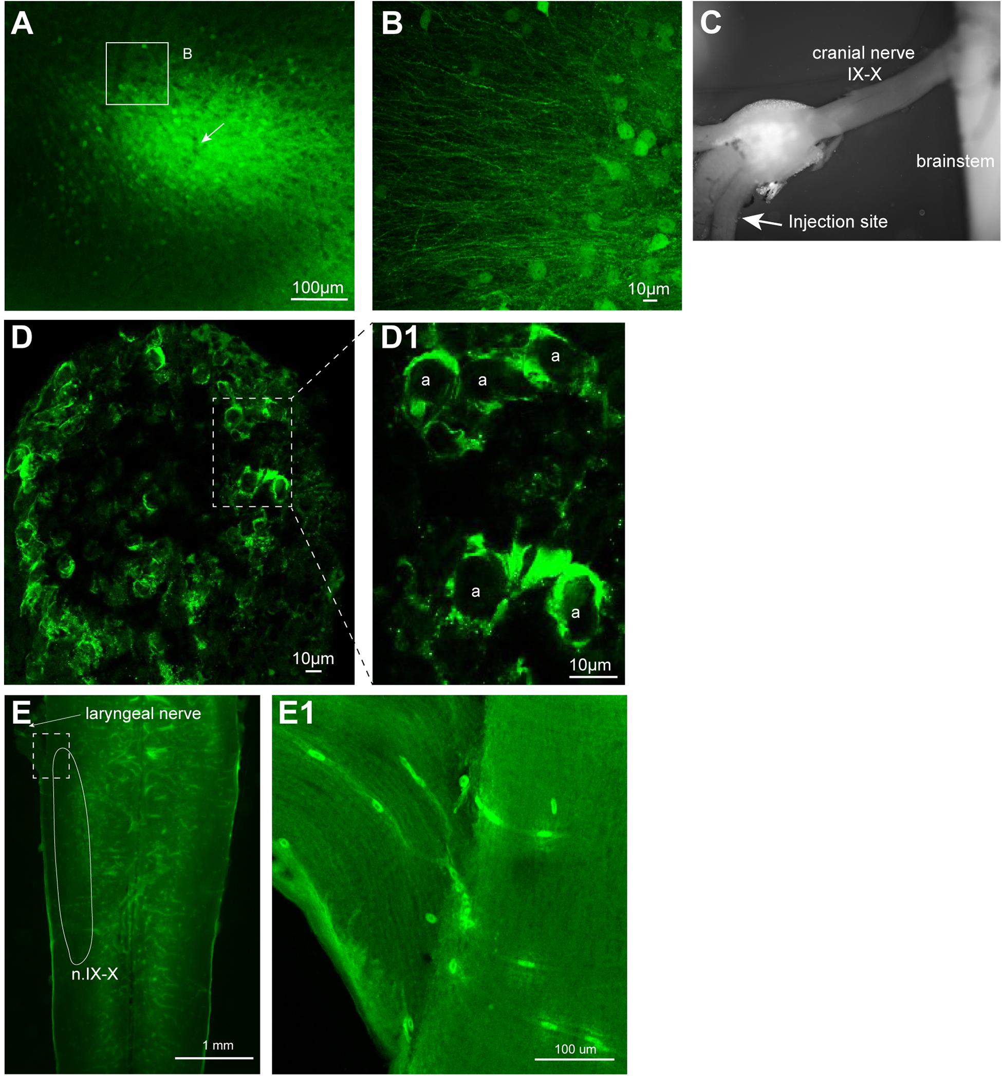 FIGURE 5. Neurons transduced by vesicular stomatitis virus (VSV) around the injection site. (A) Neurons with reporter gene expression near the injection site of recombinant vesicular stomatitis virus encoding its own glycoprotein [rVSV(VSV-G)] in the telencephalon 2 days post infection. There was a robust expression of reporter genes about 400 μm surrounding the injection site. A white arrow indicates the injection site. (B) In addition to labeled somata, there are dense processes that are labeled around the injection site. (C) The nerve injection site shown in the isolated brain. (D) Cross section of the laryngeal nerve 24 days post injection. (D1) Enlarged section of perforated rectangle shown in (E). Note that the labeling is concentrated on the periphery of the axons (a, in inset on the right). (E) The horizontal section of the brainstem of a male X. laevis with rVSV(VSV-G) injected into the cranial nerve IX-X 24 days prior. The white line encircle the n.IX-X. There was no labeled neurons nor axons found in the brainstem or the nerve. (E1) Enlarge section of a white perforated rectangle shown in (E). Labeled cells seen are autofluorescent red blood cells in the blood vessels (amphibian red blood cells are nucleated).