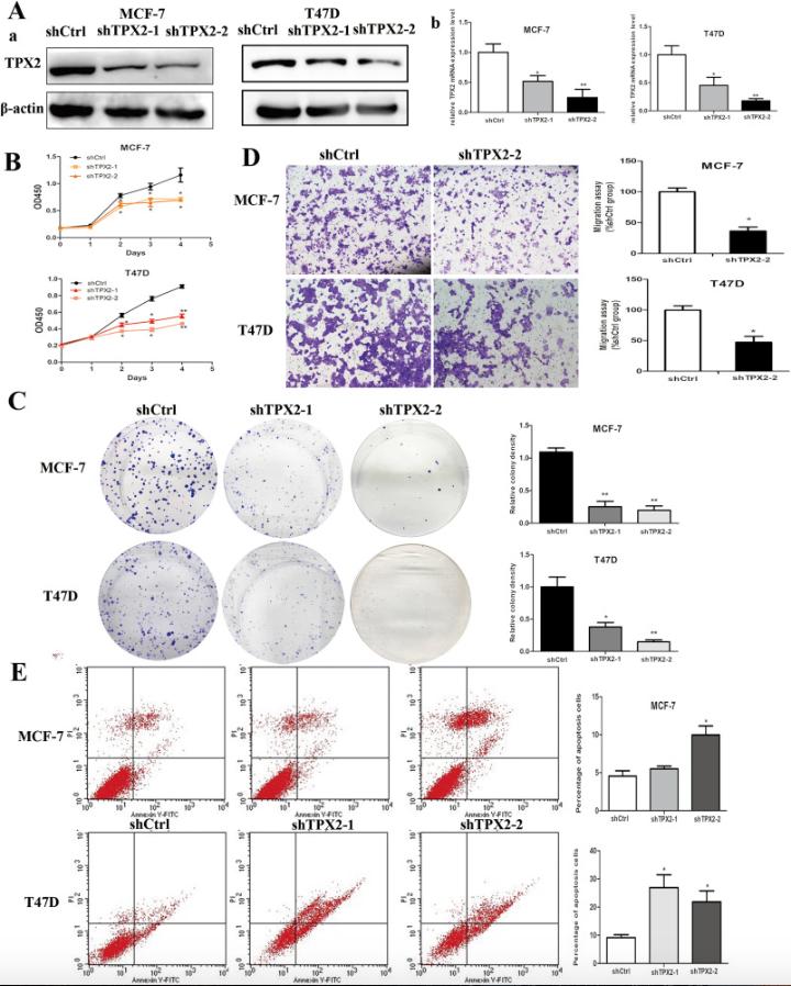 Fig. 2. TPX2 inhibition suppressed proliferation and induced apoptosis of breast cancer cells. A. TPX2 knockdown efficiency was determined by Western blot and qRT-PCR analysis in MCF-7 and T47D cells; B. Suppression of TPX2 significantly reduced the proliferation of MCF-7 and T47D cells; C. MCF-7 and T47D cells were transfected with shCtrl and shTPX2-1/2 for the clonogenic assay. Representative data and quantitative results are shown; D. Representative images showed the migration ability of MCF-7 and T47D cells transfected with shTPX2-2 or shCtrl (original magnification Ã200) and quantitative results were shown; E. The percentage of apoptosis were measured by flow cytometry in the transduced MCF-7 and T47D cells. All experiments were carried out in triplicate. Data are shown as mean ± SEM, *P < 0.05, **P < 0.01.