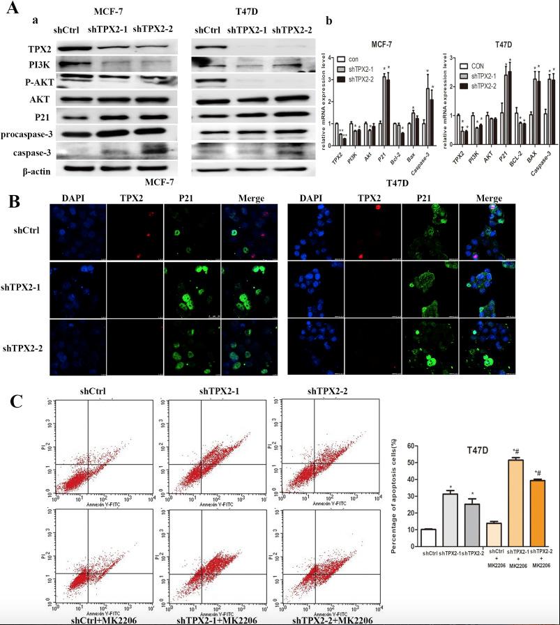 Fig. 3. TPX2 silencing inhibited the PI3K/AKT signaling pathway. A. (a) MCF-7 and T47D cells that had been transfected with shCtrl and shTPX2-1/2, respectively, were subjected to western blotting for PI3K, AKT, phosphorylated p-AKT, P21, Procaspase-3 and Caspase-3. β-actin served as the loading control; (b) qRT-PCR analysis of TPX2, PI3K, AKT, p21, Caspase-3, Bcl-2 and Bax mRNA expression in cells transfected with shTPX2-1/2 and shCtrl. β-actin served as the control; B. Immunofluorescence analysis revealed that P21 was considerably higher in TPX2 knockdown cells compared with controls. C. Suppression of TPX2 combined with MK2206 promoted cell apoptosis in T47D cells. Representative data and quantitative results of apoptosis ratio were shown. *P < 0.05, **Pâ¯<â¯0.01 compared with the shCtrl; #Pâ¯<â¯0.05, compared with the shCtrl with MK2206 group; data are meansâ¯Â±â¯SEM from three independent experiments.