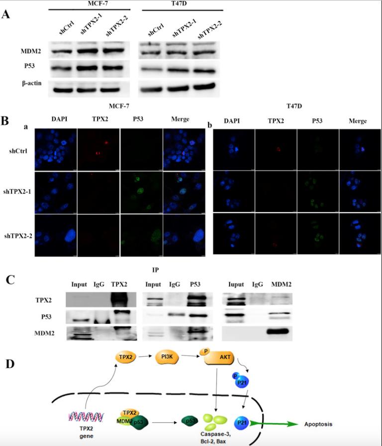 Fig. 4. Suppression of TPX2 activated p53 pathway. A. The protein expression of MDM2 and P53 in MCF-7 and T47D cells, treated with shTPX2-1/2 and shCtrl, were analyzed by western blot. B. Immunofluorescence analysis revealed that p53 was considerably higher in TPX2 knockdown MCF-7 and T47D cells compared with controls. TPX2 mainly located in spindle during mitosis and expressed in the nucleus during other phase. In shTPX2-1/2 transfected breast cancer cells, p53 mainly located at nucleolus. The DAPI nuclear staining was shown in blue, TPX2 expression in red and p53 in green. C. Western blot analysis of co-immunoprecipitated ability of TPX2, p53 and MDM2 with each other in MCF-7â¯cells. D. Schematic model of TPX2 regulates AKT signaling pathway and p53 pathway in breast cancer. (For interpretation of the references to colour in this figure legend, the reader is referred to the Web version of this article.)