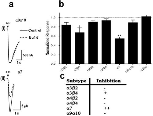 Figure 4. Eu1.6 inhibition of nicotinic acetylcholine receptor (nAChR) subtypes. Eu1.6 (10 µM) was applied by perfusion to oocytes expressing nAChRs as described in Methods. The error bars denote the S.E.M. of the data from four to six oocytes for each determination. (a) Representative ACh-evoked currents mediated by α9α10 and α7 nAChRs in the absence (control) and presence of 10 µM Eu1.6. (b) Bar graph of the mean ACh-evoked current amplitude of nAChR subtypes in the presence of 10 μM Eu1.6. Data are presented as Mean ± SEM, Statistical significance was determined with One-way ANOVA, *p < 0.05, **p < 0.001. (c) A summary of the effect of Eu1.6 on various neuronal nAChR subtypes. |