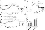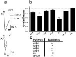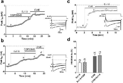 Figure 5. Eu1.6 inhibition of depolarization-activated Ba2+ currents is independent of GABAB receptor activation in mouse DRG neurons. (a) Superimposed representative time plots of IBa inhibition by 1âµM Eu1.6 in the presence of 1âµM CGP55845in mouse DRG neurons. Bars indicate the bath application of CGP55845, Eu1.6 in the presence of CGP55845, and Ï-conotoxin CVIE. Superimposed inward Ba2+ currents (bottom insets) obtained in the presence of 1âµM CGP 55845 (a), Eu1.6 in the presence of CGP 55845 (b), and 300ânM CVIE (c), are shown at the times indicated by lowercase letters. Dotted lines indicate zero-current level. (b) Time course of IBa inhibition by 1âµM Eu1.6 Eu1.6 in the presence of CGP55845 in mouse DRG neurons. Bars indicate the bath application of Eu1.6, Eu1.6 in the presence of CGP55845, and Ï-conotoxin CVIE. Application of CGP 55845 did not antagonize the effect of Eu1.6 on HVA calcium channel. (c) Time course of the inhibition of IBa by 300ânM CVIE (b) and 1âµM Eu1.6 in the presence of 300ânM CVIE (c) in mouse DRG neurons. Inward IBa elicited by step depolarization applied at 0.1âHz from a HP of â80âmV to â5âmV or 0âmV (as indicated in bottom inserts for each representative time course) plotted as a function of time. (d) Bar graph summary of inhibition of peak current amplitude by 1âµM Eu1.6, 1âµM Eu1.6 in the presence of 1âµM CGP55845, 300ânM CVIE, and 300ânM CVIEâ+â1âμM Eu1.6. Data are presented as Meanâ±âSEM. No significant difference was observed between inhibition of HVA calcium channel current by application of Eu1.6 and Eu1.6â+âCGP55845 (Pâ>â0.05, paired two-tailed t-test) and the inhibition of HVA calcium current by CVIE and CVIEâ+âEu1.6 (Pâ>â0.05, paired two-tailed t-test). Number of experiments is indicated in parentheses. |