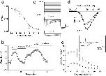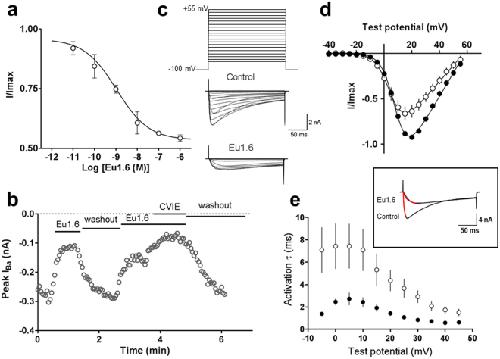 Figure 6. Eu1.6 concentration-dependent inhibition of human CaV2.2 expressed in HEK293 cells. (a) Concentration- response relationship obtained for Eu1.6 inhibition of CaV2.2 giving an IC50 of 1.1ânM and a maximum block of <50% (nâ=â4). (b) Ba2+current amplitude plotted as a function of time in the absence and presence of 1âµM Eu1.6 and 100ânM CVIE. Cells were activated by a depolarizing pulse from a holding potential of â80âmV to a test potential of +10 mv for 200âms at 0.2âHz, after reaching a plateau (max. block) cells were superfused (washout) with external bath solution for several minutes for complete recovery. (c) Voltage protocol used to determine the I-V relationship under control conditions and in the presence of 1âµM Eu1.6. Representative current traces recorded over a series of depolarizing testing potentials from a holding potential of â100âmV to â40âmV to +55âmV (â5âmV increments) under control conditions and after >2âmin. exposure to 1âµM Eu1.6 in the external bath solution. (d) I-V relationship recorded at certain time points in the absence (filled circle) and presence of Eu1.6 (open circle). (e) Activation kinetics (tau) measured in the absence (control, filled circle) and presence of 1âµM Eu1.6 (open circle) was determined by a mono-exponential function (inset) for a series of testing potentials derived from the same I-V traces. |