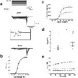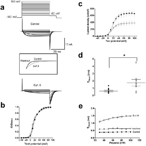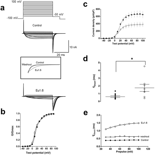 Figure 7. Eu1.6 slows deactivation kinetics of CaV2.2 channel. (a) Tail currents were determined at a repolarizing potential (â50âmV) for 10âms in the absence (control) and presence of Eu1.6. Insert: expanded time scale of superimposed tail currents obtained in the absence (control, black line; washout, dashed line) and presence of Eu1.6 (grey line). (b) Conductance-voltage (G-V) relationships determined from tail currents recorded in the absence (control, filled circle) and presence of Eu1.6 (open circle). The current was normalized to its maximum current and fitted with a double Boltzmann function. (c) Current density plot was derived from the current amplitude (pA) divided by the cell capacitance (pF). See Supp. Tables S2 and S3 for parameter and significance testing. (d) Deactivation kinetics (tau) was determined by a mono-exponential fit of tail currents. The scatter plot depicts the deactivation kinetics in the absence (filled circle) and presence of Eu1.6 (open circle) for a series of experiments at a single prepulse potential. Statistical significance was determined with an unpaired t-test, *pâ<â0.05. (e) Representative deactivation kinetics of currents traces recorded in the absence (control, filled circle), after incubation (>2âmin.) with Eu1.6 (open circle) and upon washout (open diamond). |