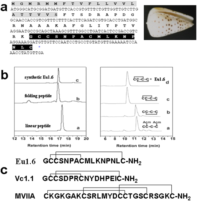 Figure 1. Cloning, synthesis and folding of α-conopeptide Eu1.6. (a) The cDNA sequence and predicted translation product of Eu1.6 (above). The signal peptide and mature toxin are shaded. The signal peptide is shown in gray, the propeptide is underlined, and the mature peptide is shown with white text on a blackground. HPLC analyses of the folded products of linear Eu1.6 and its Acm derivatives. Photograph of C. eburneus shell (right). (b) One-step oxidative folding of Eu1.6 (left). Traces from bottom to top: (a) linear peptide; (b) one-step oxidized products; (c) purified product. Determination of the disulfide bond connectivity of Eu1.6 (right). Traces from bottom to top: (a) Linear peptide with Acm modification at Cys 2 and Cys 4; (b) the first oxidized product; (c) The second oxidized product and (d) Co-elution of the two-step folding products and one-step folding products. Samples were applied to a Calesil ODS-100 C18 column (4.6 mm × 250 mm) and eluted with a linear gradient of 0~1 min, 5–10% B (B is acetonitrile (0.1% TFA); 1~25 min, 10~50% B; 25~28 min, 50~95% B at a flow rate of 1 ml/min, 214 nm of wavelength. (c) Comparison of the primary structure of Eu1.6 with other α-conotoxins that act on nAChRs and GABAB receptor/CaV2.2. |