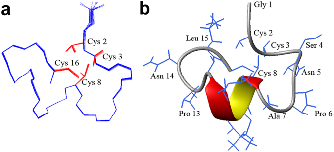 Figure 2. NMR solution structure of Eu1.6. (a) Backbone ensemble of 20 lowest energy structures. The side chains of Cys residues are shown in red. (b) Ribbon representation of the closest-to-mean structure. |