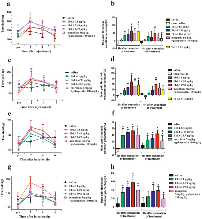 Figure 3. Analgesic activity of Eu1.6 in rat PNL and CCI pain models. (a,b,e,f) PNL and CCI rats (n = 8/group) were treated with sterile saline (i.m.), Eu1.6 (0.5, 2.49 and 24.9 μg/kg, i.m.), Vc1.1 (27.2 μg/kg, i.m.), or a combination of morphine (5 mg/kg), subcutaneous injection (sc) and gabapentin (100 mg/kg, intragastric administration (i.g.). Sham rats (n = 8) were treated with sterile saline (i.m.). (c,d,g,h) PNL and CCI rats (n = 8/group) were treated with sterile saline (i.v.), Eu1.6 (1, 4.98 and 49.8 μg/kg, i.v.) or the combination of morphine (5 mg/kg, sc) and gabapentin (100 mg/kg, i.g.). The LHS graphs shows the mean pain threshold at pre-injection and 2, 4 and 6 h following treatments (a,c,e,g), whereas the RHS bar graphs show the corresponding elevation percentage at 2 h and 4 h following treatments (b,d,f,h). The different groups were analyzed by one-way ANOVA followed by the LSD test for multiple comparison tests at a 0.05 level of significance. *p < 0.05 vs. saline, #p < 0.05 Eu1.6 (low dose group) vs. Vc1.1 or the combined group of morphine and gabapentin. |