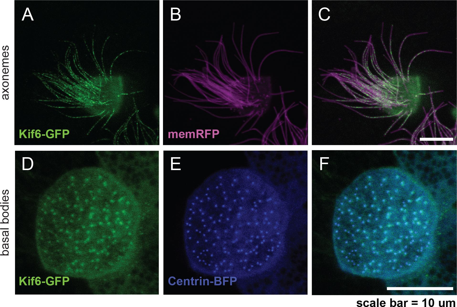 Confocal imaging of the mucocilated Xenopus laevis epidermis demonstrating consistent Kif6-GFP localization within the axonemes (green; A, C) and at the basal bodies (green; D, F). Expression of pan-membrane-RFP marker (magenta; B, C) to co-label the axonemes and Centrin-BFP (blue; E, F) to co-label the basal bodies. Scale Bars: 10μm.