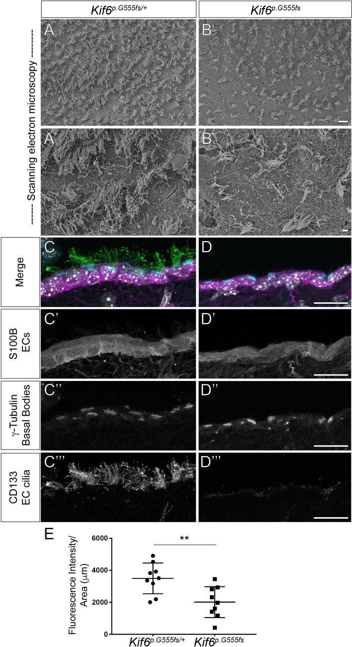 Fig 4. Kif6 mutant mice have defects in formation of ependymal cell cilia.(A-B') Scanning electron microscopy of the lateral ventricular wall (en face view) in Kif6p.G55 homozygous mutant mice and heterozygous littermate controls at P21, demonstrating a reduction in the number and density of EC cilia tufts in mutant ventricles (B, B’). (C-D‴) Immunofluorescence of the wild-type (C-C”‘) and Kif6p.G55 homozygous mutant (D-D”‘) mice at P21. (C-D) Three color merge of (C', D') αS100B (ependymal cell marker; magenta) channel; (C'', D'') α–γ-tubulin (basal bodies; cyan) channel; and (C‴, D‴) αCD133 (EC axoneme marker, Prominin-1; green). (C', D') αS100B staining showing no alterations of ependymal cell specification between Kif6p.G55 homozygous mutant and WT mice. (C'', D'') α–γ-tubulin staining showing typical basal body positioning at the apical surface of ECs in both Kif6p.G55 homozygous mutant and WT mice. (C‴, D‴) αCD133 staining reveals a marked of EC cilia projecting into the ventricular lumen in Kif6p.G555fs homozygous mutant mice compared to WT mice. (E) Quantitation of fluorescent intensity of the CD133 channel (EC axonemes). Scale bars: 20μM in (A, B); 2 μM in (A', B'); and 20 μM in (C-D‴).