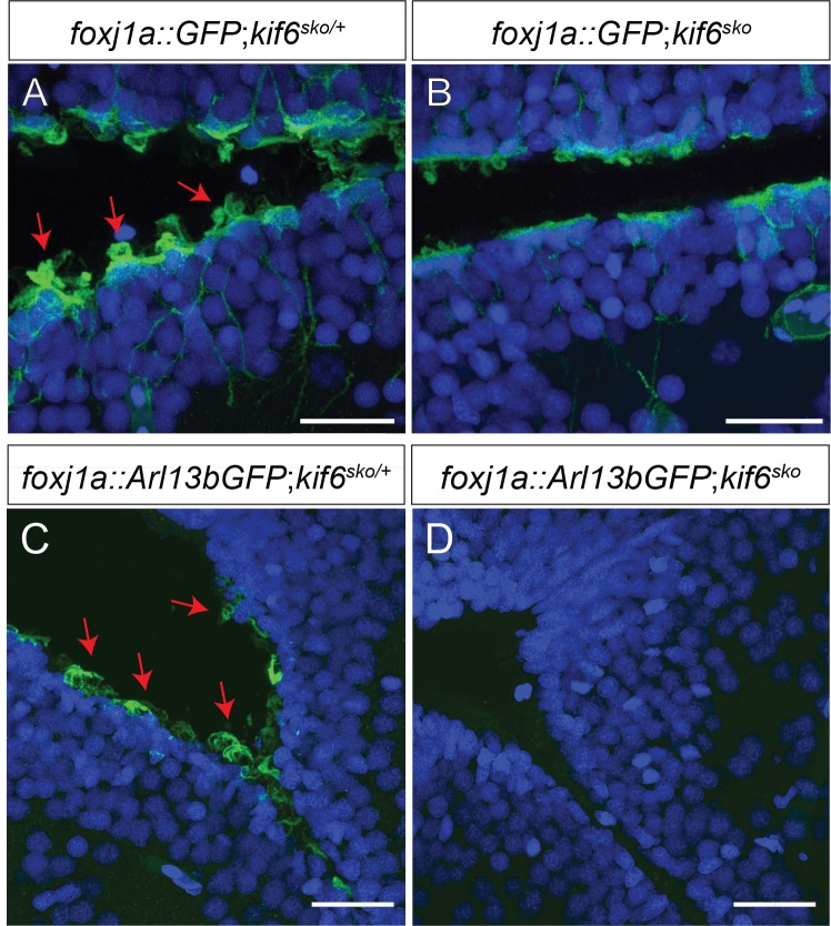 Fig 6. kif6 mutant zebrafish display defects in the formation of the ependymal cell cilia in the brain.(A-D) Immunofluorescence of Tg[foxj1a::GFP] (A, B) and Tg[foxj1a::Arl13bGFP] transgenic zebrafish in both heterozygous kif6sko/+ (A, C) and homozyogus kif6sko mutant (B, D) zebrafish backgrounds assayed with αGFP (green) and DAPI (nuclei, blue). The Tg[foxj1a::GFP] transgene demonstrates that GFP positive ECs are present in both genotypes. In contrast, kif6sko/+ heterozygous zebrafish display numerous apical tufts of cilia (red arrows; A) projecting into the ventricle lumen, which are markedly reduced in kif6sko mutant zebrafish (B). Similar results were observed with the Tg[foxj1a::Arl13bGFP] transgene, showing a obvious reduction in Arl13b-GFP positive EC axonemes in kif6sko mutant zebrafish (D), which are robustly labeled in kif6sko/+ heterozygous fish (C). Scale Bars: 20μm.