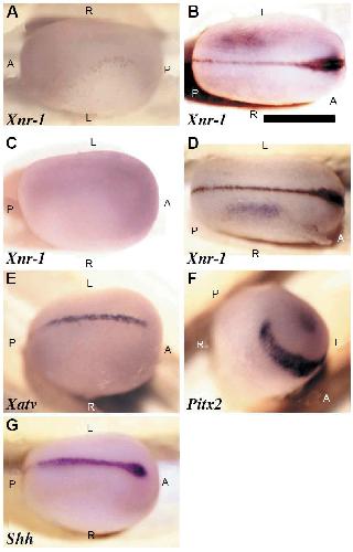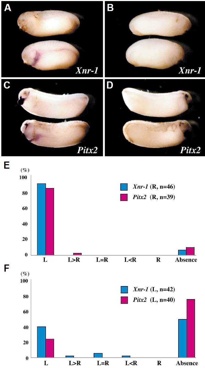 Xnr-1 (A), Xatv (D) and Pitx2 (F) were expressed on the left . After injecting