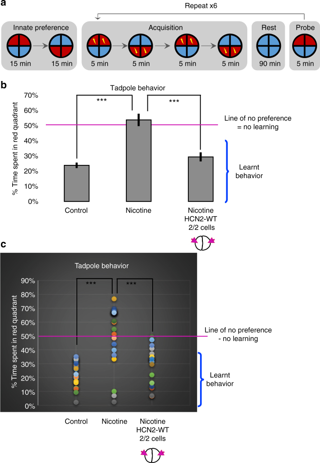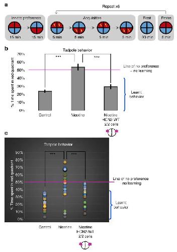 Figure 7. HCN2 channels restore associative learning capacity in nicotine-exposed embryos. Associative learning capacity analysis for stage 45â50 tadpoles either left untreated (controls) or exposed to nicotine (0.1âmg/mL â stage 10â35) with or without microinjections of Hcn2-WT mRNA (0.75 ng/injection) in both blastomeres at 2-cell stage as indicated in the illustrations. a) The training regime used consisted of an innate preference test, a training phase, a rest period, and a learning probe. Tadpoles were placed individually in the behavior analysis robot. Motion tracking cameras under each tadpole recorded its position/behavior, and automated software executed a training cycle where animals received a shock when occupying the red half of the arena. Training, rest and testing sessions were repeated a total of six times across the trial. b) Quantification of time spent in the red color during the final testing probe for tadpoles in each treatment group. Nâ>â20 for each experimental group. Error bars indicateâ±âS.E.M. Data were analyzed using one way ANOVA ***pâ<â0.001. c Representation of individual tadpoleâs associative learning test. Nâ>â20 for each experimental group. Following the training sessions a significant red light aversion was generated in control tadpoles. Majority of nicotine-exposed tadpoles failed to demonstrate red light aversion learning during testing. Nicotine-exposed tadpoles microinjected with Hcn2-WT mRNA showed a restored ability to learn associative red light aversion |