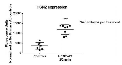 Supplementary Fig. 3: HCN2 expression levels in Hcn2-WT injected embryos. Quantification of HCN2 immunostained stage ~12 Xenopus embryos which were either left uninjected (controls) or injected with Hcn2-WT mRNA in both blastomeres at two-cell stage. Hcn2-WT injected embryos show a significantly high level of HCN2 channel expression (~3.1 times/310%). Embryos were obtained from multiple animals across independent clutches. Immunostaining was quantified using ImageJ software. Data were analyzed by t-test and plotted as mean ± SD; ***-p<0.001. |