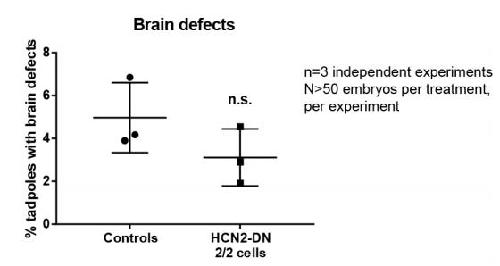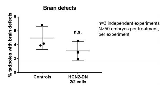 Supplementary Fig. 4: Hcn2 Dominant-negative mRNA has no effect on brain patterning. Quantification of stage 45 tadpoles for major brain morphology phenotypes in uninjected (controls) and Hcn2-Dominant-negative (Hcn2-DN) injected (in both blastomeres at two-cell stage) embryos. No significant increase in incidence of malformed brain was observed in embryos injected with Hcn2-DN. Three independent experiments (n=3) were conducted with N>50 embryos per treatment group for each of those experiments collected from multiple animals across independent clutches. Data were analyzed with t-test and graphed as mean ± SD; n.s. = not significant. |