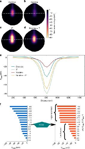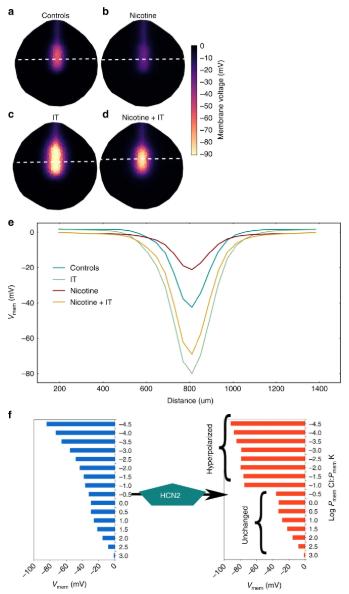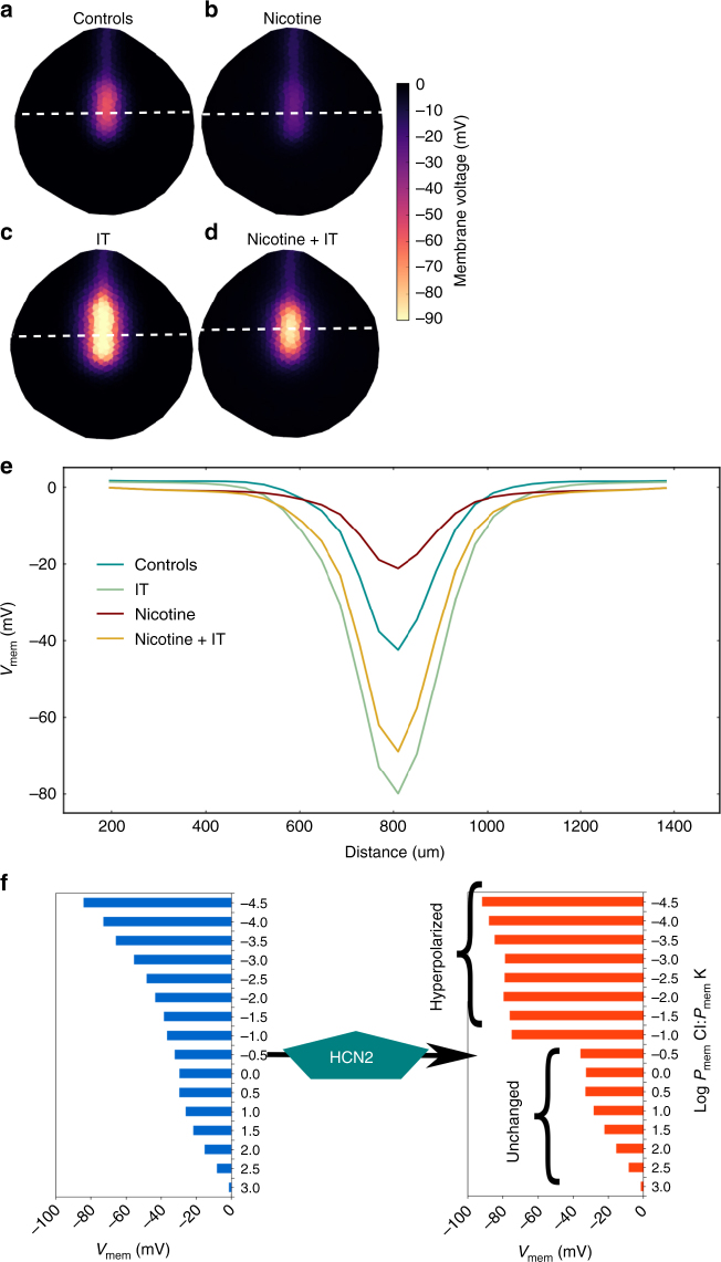 Fig. 3. BETSE model predicts that nicotine suppresses neural tube hyperpolarization and HCN2 recovers neural tube hyperpolarization in presence of nicotine. a–e BETSE model of a stage 15 Xenopus embryo where cells are assumed to be facing 0.1 × MMR. a Control model exhibits a characteristic Vmem pattern featuring relative hyperpolarization in the neural tube area and depolarization everywhere else. This Vmem pattern is actually seen in the Xenopus embryos with voltage reporter dyes28. b Nicotine treatment of the control model is predicted to preferentially depolarize the neural tube area to suppress the Vmem gradient. c Model with ion translocator (IT) expression in all cells, acting in a context-specific manner showing strongly enhanced neural tube Vmem pattern. d Adding the ion translocator (IT) to the nicotine treated model shows the Vmem pattern significantly retained in comparison to the only nicotine treated model of b. e Line graph showing the information retrieved along the white dotted lines depicted in (a–d), which allows for easy comparison between models. f The effect of the HCN2 channel on the Vmem of a series of cells with different membrane leak permeabilities (Pmem). The ability of homogeneously expressed HCN2 channels to act in a context specific manner is predicted to stem from the channels’s opening at hyperpolarized Vmem with a hyperpolarizing effect upon opening. This selectively hyperpolarizes cells while leaving relatively more depolarized cell’s Vmem unchanged. This further emphasizes that HCN2 channels amplify the endogenous Vmem pattern of the neural tube and maintain the Vmem pattern against nicotine depolarization exactly like IT in (c, d and e) |