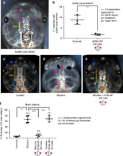 Figure 5. HCN2 channels rescue nicotine-induced brain morphology defects in Xenopus embryos. a) Representative image of stage 45 tadpole with an example of a minor brain morphology defect showing smaller forebrain and nostril on the left (magenta arrowhead), normal midbrain (MB - yellow bracket) and normal hindbrain (HB - cyan bracket). b) Quantification of stage 45 tadpoles for subtle changes in overall brain morphology with or without microinjecting Hcn2-WT (wild-type) mRNA (0.75âng/injection) in both blastomeres at 2-cell stage as indicated in the illustrations. Hcn2-WT mRNA injections significantly suppress the minor brain defects seen in uninjected control embryos. Three independent experiments (nâ=â3) were conducted with Nâ>â50 embryos per treatment group for each of those experiments, collected from multiple animals across independent clutches. Data were analyzed with t-test and graphed as meanâ±âSD, **pâ<â0.01. Representative images of stage 45 tadpoles: c) control tadpole showing nostrils (blue arrowhead), forebrain (FB) indicated by the orange bracket, midbrain (MB) indicated by the yellow bracket, and hind brain (HB) indicated by the cyan bracket, d) tadpole from embryos exposed to nicotine (0.1âmg/mL â stage 10â35) showing severe brain morphology defects as indicated by magenta arrowheads. e) tadpole from embryos exposed to nicotine (0.1âmg/mL â stages 10â35) and microinjected with Hcn2-WT mRNA (0.75 ng/injection) in both blastomeres at 2-cell stage showing intact nostrils (blue arrowheads), forebrain (FB - orange brackets), midbrain (MB - yellow brackets), and hindbrain (HB - cyan brackets). f) Quantification of stage 45 tadpoles for major brain morphology phenotypes in absence or presence of nicotine exposure (0.1âmg/mL â stage 10â35) with or without microinjection of Hcn2-WT or Hcn2-DN (dominant-negative) mRNA (0.75 ng/injection) in both blastomeres at 2-cell stage as indicated in the illustrations. A significantly high incidence of malformed brain was observed in embryos exposed to nicotine in comparison to controls. Hcn2-WT mRNA injection significantly reduced the incidence of malformed brain, while Hcn2-DN mRNA injection had no significant effect on nicotine exposure induced malformed brain. Three independent experiments (nâ=â3) were conducted with Nâ>â50 embryos per treatment group for each of those experiments collected from multiple animals across independent clutches. Data were analyzed with one way ANOVA and Tukeyâs post-test and graphed as meanâ±âSD,***pâ<â0.001, n.s. non-significant |