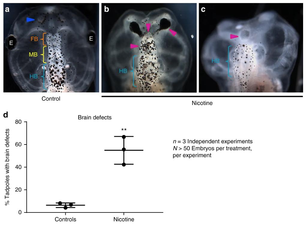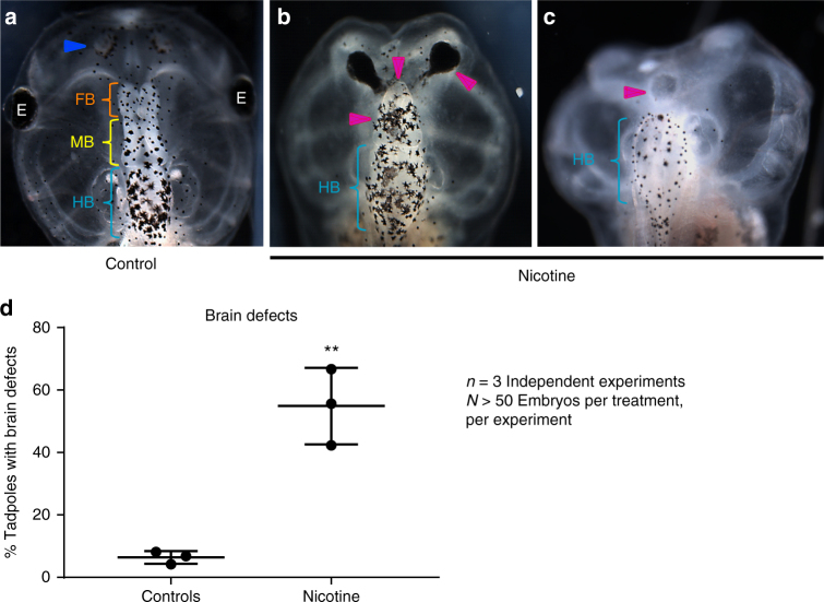 Figure 1. Nicotine induces brain morphology defects in Xenopus embryos. Representative images of stage 45 tadpoles: a) control tadpole showing nostrils (blue arrowhead), forebrain (FB) indicated by the orange bracket, midbrain (MB) indicated by the yellow bracket, and hind brain (HB) indicated by the cyan bracket, b and c) tadpoles from embryos exposed to nicotine (0.1âmg/mL â stage 10â35) showing severe brain morphology defects as indicated by magenta arrowheads. Cyan brackets indicate presence of hindbrain (HB). d) Quantification of stage 45 tadpoles for major brain morphology phenotypes in absence or presence of nicotine exposure (0.1âmg/mL â stage 10â35). A significantly high incidence of malformed brain was observed in embryos exposed to nicotine in comparison to controls. Three independent experiments (nâ=â3) were conducted with Nâ>â50 embryos per treatment group for each of those experiments collected from multiple animals across independent clutches. Data were analyzed with t-test and graphed as meanâ±âSD; **pâ<â0.01 |