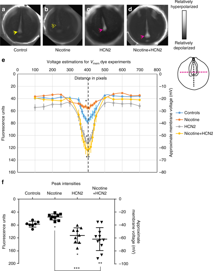 Fig. 4. Validation of the model prediction of nicotine effects and HCN2-induced recovery of membrane voltage prepatterns. Representative CC2-DMPE:DiBAC4(3) images of stage ~15 Xenopus embryos: a untreated controls, b nicotine-exposed (0.1 mg/mL – stage 10–35), c Hcn2-WT mRNA microinjected (0.75 ng/injection) in both blastomeres at 2-cell stage, and d nicotine-exposed (0.1 mg/mL – stage 10–35) and Hcn2-WT mRNA microinjected (0.75 ng/injection) in both blastomeres at 2-cell stage. Control embryos show the characteristic hyperpolarization (solid yellow arrow) as previously reported28. Nicotine-treated embryos show reduced signal (depolarized) within the neural tube (hollow yellow arrow). Hcn2-WT mRNA microinjection show enhanced signal (hyperpolarized) within the neural tube (magenta arrows), in presence or absence of nicotine exposure. e Quantification of CC2-DMPE:DiBAC4(3) images of stage ~15 Xenopus embryos along the red dotted line as indicated in the inset illustration, along with electrophysiology based membrane voltage approximations (as previously reported in refs.27,28). The fluorescence intensity/membrane voltage pattern within the neural tube (indicated by the black dotted line in the inset illustration and corresponding lack dotted line in the graph) is significantly reduced (depolarization) in nicotine-exposed embryos in comparison to controls. Hcn2-WT mRNA microinjection significantly enhances the fluorescence intensity/membrane voltage patterns within the neural tube in comparison to controls. Nicotine-exposed embryos that are microinjected with Hcn2-WT mRNA maintain a significantly enhanced fluorescence intensity/membrane voltage pattern within the neural tube in comparison to only nicotine-treated embryos. N = 10 embryos for each treatment group at each of the indicated spatial distance in pixels were collected from multiple animals across independent clutches. Data is plotted as mean ± S.E.M. Data at black line (400 Pixels) was analyzed using one way ANOVA, *p < 0.05, **p < 0.01. (f) Quantification of peak fluorescence intensity and electrophysiology based membrane voltage approximations (as previously reported in ref. 27,28) from voltage reporter dye images (CC2-DMPE:DiBAC4(3)) of ~stage 15 Xenopus embryos within the neural tube at the intersection of the red and black dotted lines in the inset illustration in (a). Nicotine exposure significantly reduced (depolarizes) the neural tube peak intensity/membrane voltage in comparison to controls. Hcn2-WT mRNA microinjection, both in presence or absence of nicotine, significantly enhances (hyperpolarizes) the neural tube peak intensity/membrane voltage in comparison to controls. N = 10 embryos for each treatment group at each of the indicated spatial distance in pixels were collected from multiple animals across independent clutches. Data is plotted as mean ± SD and was analyzed using one way ANOVA, *p < 0.05, **p < 0.01, ***p < 0.001 |