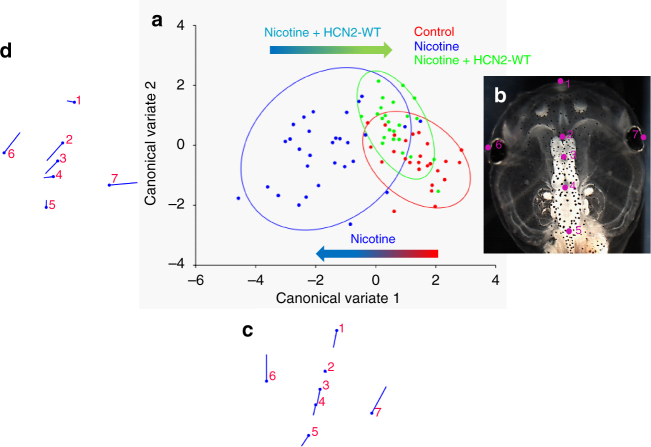 Fig. 6. HCN2 channels restore the brain size relation to anterior head shape in nicotine-exposed embryos. Morphometrics canonical variate analysis of brain size relation to anterior head shape of stage 45 tadpoles. a Graphical output, showing confidence ellipses for means, at a 0.95 probability, of shape data from controls and nicotine-exposed (0.1 mg/mL – stage 10–35) tadpoles with or without Hcn2-WT mRNA (0.75 ng/injection) microinjected in both blastomeres at 2-cell stage. Ellipses are colored to correspond with treatment as indicated. N > 26 for each group. Procrustes distances show objective alteration of brain size in relation to head morphology by nicotine exposure in relation to controls as indicated by the red-blue arrow. Hcn2-WT mRNA microinjection along with nicotine exposure moves the brain size—head shape relation closer to controls as indicated by the blue-green arrow. b Stage 45 control tadpole image illustrating the 7 landmarks considered for this analysis comparing brain size and head shape. Landmarks 2, 3, 4, and 5 show the start of forebrain, transition to midbrain, transition to hindbrain, and end of hindbrain, respectively. Landmarks 1, 6, and 7 indicate the anterior most, and lateral most points of the head shape. c Canonical variate 1 axis legends (ball and stick diagrams) showing movement of each of the 7 landmarks in mainly anterior-posterior direction. Each ball represents the landmark as indicated by the number and the accompanying stick represents the direction and extent of movement of that particular landmark. d Canonical variate 2 axis legends (ball and stick diagrams) showing movement of each of the 7 landmarks in mainly lateral direction. Each ball represents the landmark as indicated by the number and the accompanying stick represents the direction and extent of movement of that particular landmark |