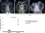 Figure 6. HCN2 channels restore the brain size relation to anterior head shape in nicotine-exposed embryos. Morphometrics canonical variate analysis of brain size relation to anterior head shape of stage 45 tadpoles. a) Graphical output, showing confidence ellipses for means, at a 0.95 probability, of shape data from controls and nicotine-exposed (0.1âmg/mL â stage 10â35) tadpoles with or without Hcn2-WT mRNA (0.75 ng/injection) microinjected in both blastomeres at 2-cell stage. Ellipses are colored to correspond with treatment as indicated. Nâ>â26 for each group. Procrustes distances show objective alteration of brain size in relation to head morphology by nicotine exposure in relation to controls as indicated by the red-blue arrow. Hcn2-WT mRNA microinjection along with nicotine exposure moves the brain sizeâhead shape relation closer to controls as indicated by the blue-green arrow. b) Stage 45 control tadpole image illustrating the 7 landmarks considered for this analysis comparing brain size and head shape. Landmarks 2, 3, 4, and 5 show the start of forebrain, transition to midbrain, transition to hindbrain, and end of hindbrain, respectively. Landmarks 1, 6, and 7 indicate the anterior most, and lateral most points of the head shape. c) Canonical variate 1 axis legends (ball and stick diagrams) showing movement of each of the 7 landmarks in mainly anterior-posterior direction. Each ball represents the landmark as indicated by the number and the accompanying stick represents the direction and extent of movement of that particular landmark. d) Canonical variate 2 axis legends (ball and stick diagrams) showing movement of each of the 7 landmarks in mainly lateral direction. Each ball represents the landmark as indicated by the number and the accompanying stick represents the direction and extent of movement of that particular landmark |