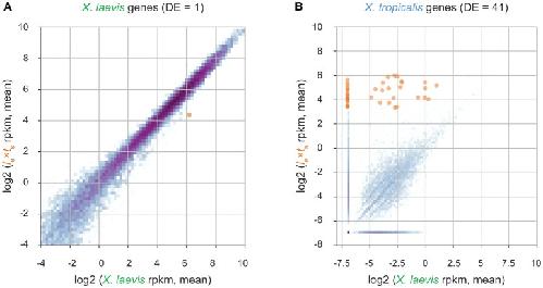 Figure 3. Transcriptome analysis of le × ts hybrid embryos at the onset of zygotic genome activation. (A) Differential expression analysis of X. laevis maternal genes in stage 9 le × ts hybrid vs. X. laevis embryos. (B) Differential expression analysis of X. tropicalis paternal genes in stage 9 le × ts hybrid vs. X. laevis embryos. For both figures, RNA-seq reads are mapped to a database of combined X. laevis and X. tropicalis transcriptomes and significantly differentially expressed genes (DE; fold-change >2 and false discovery rate < 0.05) are marked in orange (see section Materials and Methods for more information).