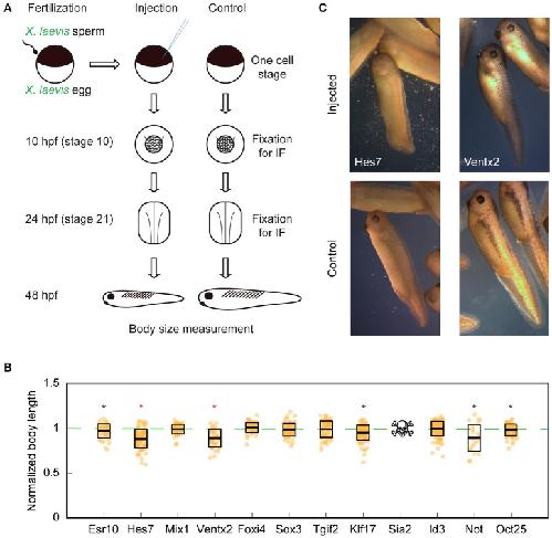 Figure 4. Organismal size in X. laevis embryos upon overexpression of candidate X. tropicalis transcription factors. (A) Workflow of candidate scaling factor screen. (B) Body length of tailbud stage injected X. laevis embryos. Thick line inside box = average length, upper and lower box boundaries = ±SD. Stars indicate the significance of the pooled results of 3 experiments with p < 0.05 (two-tailed heteroscedastic t-test). Red coloring indicates significance of each 3 individual technical replicates with p < 0.05 (two-tailed heteroscedastic t-test). Reduced number of measured embryos in Not is due to the fact that, overall, 67.5% of injected-embryos exogastrulated, indicating a developmental defect. (C) Representative images of injected X. laevis embryos 48 h post-fertilization. Hes7- (left) and Ventx2-injected (right) are shown (top) with corresponding controls (bottom). Images are at identical scale.