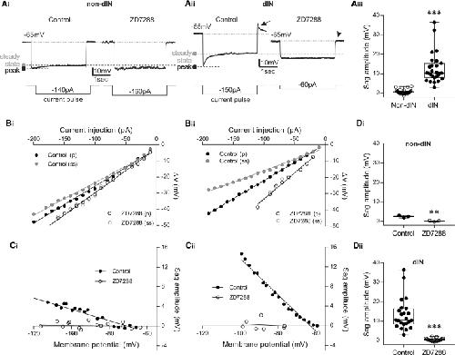 Figure 2. Ih Is Present in All dINs and in Some Non-dINs and Is Blocked by ZD7288(A) An example of a sag potential in a non-dIN (Ai) with and without ZD7288 (50 μM). The peak and steady-state membrane potential responses are indicated by dashed lines. (Aii) An example response of a dIN to hyperpolarizing current pulses (3-s duration). ZD7288 (10 μM) hyperpolarized the RMP (see also Figure 3) and abolished the large sag potentials observed at hyperpolarized membrane potentials. Arrow, post-inhibitory depolarization seen in control; arrow head, the membrane potential rebound was absent in the presence of ZD7288. (Aiii) Pooled data showing a comparison of the sag amplitude between −80 and −90 mV in dINs (n = 27) and non-dINs (n = 34; ∗∗∗p < 0.001; median with 50% IQR displayed as box-and-whisker plots).(B) The voltage-current (V-I) relationship for a non-dIN (Bi) and a dIN (Bii) in response to hyperpolarizing current pulses (3-s duration) of increasing amplitude (10 pA incremental steps) and the effect of 10–50 μM ZD7288. For both control (closed circles) and in ZD7288 (open circles), the peak (p) and the steady-state (ss) membrane potential change are plotted against each injected current amplitude.(C) The amplitude of the sag potentials in a non-dIN (Ci) and a dIN (Cii) was plotted against the membrane potential with (open circles) or without (closed circles) ZD7288.(D) Pooled data showing that ZD7288 (10–50 μM) significantly abolished the sag potential observed around −80 mV. Data are expressed as median with 50% IQR and displayed as box-and-whisker plots with individual data points. (Di): 3 non-dINs, p = 0.0048; (Dii): 23 dINs, p < 0.001; ∗∗p < 0.01; ∗∗∗p < 0.001. See also Figure S2.