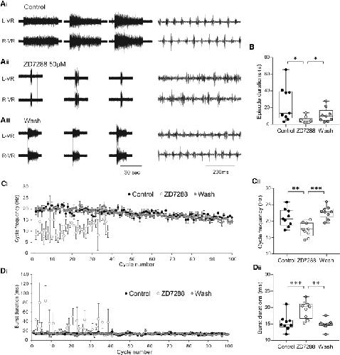 Figure 4. The Effects of ZD7288 on Xenopus Swim Network Output(A) Two simultaneously recorded raw ventral root traces on the left and right sides showing evoked swim episodes in control (Ai), in the presence of the Ih current blocker ZD7288 (50 μM; Aii), and after washout (Aiii). The right side panels show an expansion of fictive swimming activity.(B) ZD7288 (10–50 μM) significantly shortened episode duration (p = 0.026), and the effect was reversed following washout of ZD7288 (n = 9 complete experiments; p = 0.027; median with 50% IQR displayed as box-and-whisker plots).(C) Time plot showing (Ci) mean swim cycle frequency across 3 evoked episodes in control, ZD7288, and after washout. Note that the swim frequency is lower and more variable. (Cii) ZD7288 (50 μM) caused a significant decrease in cycle frequency (p = 0.0008; n = 9; median with 50% IQR displayed as box-and-whisker plots).(D) Time plot showing (Di) mean burst durations across 3 evoked episodes in control, ZD7288, and following washout. (Dii) ZD7288 (50 μM) caused a significant increase in burst duration (p = 0.0018; n = 9; median with 50% IQR displayed as box-and-whisker plots).∗p < 0.05; ∗∗p < 0.01; ∗∗∗p < 0.001. See also Figure S3.