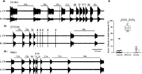 Figure 7. Block of Ih Current Disrupts the Relationship between Swim Interval and Episode Duration and Increases Swimming Failure at Short Intervals(A) Raw traces showing two simultaneously recorded ventral root traces on the left (L-VR) and right (R-VR) sides showing evoked swim episodes using variable inter-episode intervals. In control conditions (Ai), shortening the inter-episode interval reduces episode duration, but swimming can still be reliably evoked at very short intervals (≤2 s). In the presence of ZD7288, swimming initiation failed at short intervals (Aii; crosses, stimuli failing to evoke swimming), an effect which reversed upon drug washout (Aiii).(B) Pooled data illustrating that block of Ih significantly increases the swim failure rate at short inter-swim intervals (n = 6; median with 50% IQR displayed as box-and-whisker plot). ∗∗∗∗p < 0.0001.